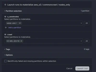 Dagster offers great observability and orchestration capabilities - in particular for multidimensional partitions. We partition the data along two axes: time and domain. Time follows the data’s natural parts. Domain is a custom partitioning. It lets us process different research questions in parallel. For example, we can apply different filters to the graph.