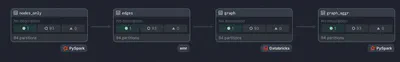 With dagster multiple steps can be chained easily. To showcase the swap of the execution environment: you can see that some assets use Pyspark in local mode. Others use EMR and others use Databricks.
