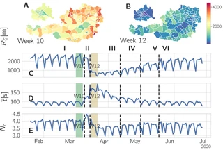 Population-wide response to the COVID-19 crisis. The maps show the mobility (radius of gyration, RG) for cal- endar week (A) 10 and (B) 12 for Austria. The timeseries below outline the changes in (C) RG, (D) the call duration per call t, and (E) the number of calls per device Nc. During the lock-down mobility was drastically reduced throughout Austria. The call duration per call t increased dramatically and the number of calls, after a brief increase around the beginning of the lock-down, dropped below the pre-lock-down level.Abstract