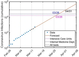 Estimate of the hospitalized infections based on historic case numbers of the last two weeks at that time (blue dots) and a prediction of hospitalized case numbers for the coming month (brown line). Horizontal dashed lines indicate the number of available hospital beds.Abstract